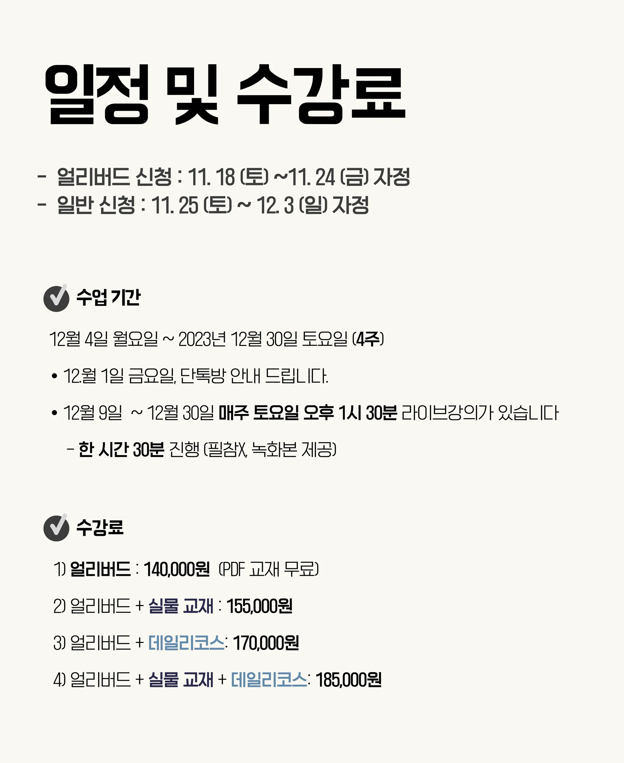 정규반 초급 얼리버드 + 실물 교재 + 데일리코스 병행 시 : 185,000원